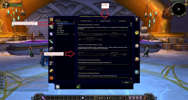 Now before we really get into the nuts and bolts of this I want to explain what we will be doing at this stage. I have already mentioned that we will be setting up "Categories" and "Groups" but what are they? Basically they are sets of items that you think are similar enough in price that you will list them within the same price limits (meaning they will have the same minimum posting price and the same maximum posting price). Personally the best way I have come up with to set these up is to group them by price and item type. In this type of setup some sample categories might be, leatherworking, glyphs, blacksmithing, enchants, engineering items etc. Under each category I then set up groups which would have names like, 1-10 gold, 10-25 gold, 25-50 gold, etc. Using this set up the group's name is the posting limits that you have set and the category tells you what type of items are in that group. If you want to change the price of an item later simply go to it's group (which should be pretty easy to find if your categories are set up correctly) and move the item from one group into another.
